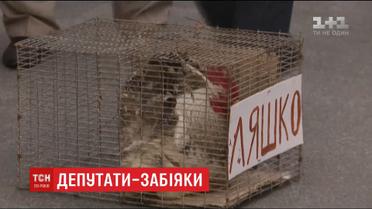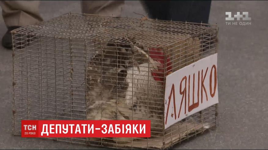 За мить до появи головного радикала, Каплін показав клітку із живим півнем з написом "Ляшко" і нагодував птаха ксерокопіями доларів. На провокацію відгукнувся Ігор Мосейчук. Він вступив в словесну перепалку, а коли слова закінчились, схопив клітку із живим півнем і жбурнув нею в бік опонентів.