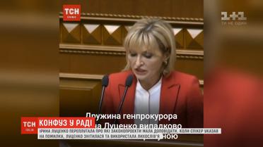 Після ухвалення змін до Конституції, які закріплюють зовнішньополітичний курс на євроатлантичну інтеграцію, всі так раділи, що Ірина Луценко навіть переплутала законопроекти. Коли ж спікер вказав на помилку, представниця Порошенка у верховній раді засмутилася, використала вульгарну частку мови.
