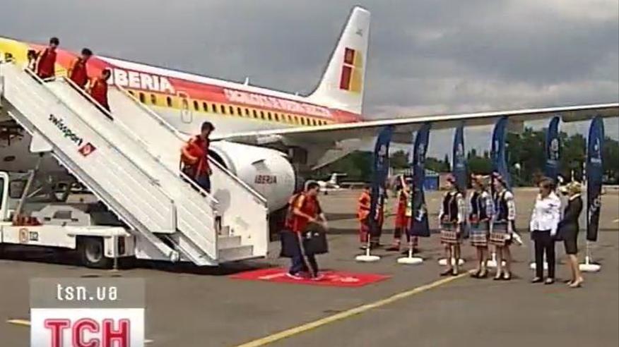 По-обіді хлопці прилетіли з Донецька. Звичаю з короваєм не зрозуміли, а один із тренерів непомітно взяв його і поклав до автобуса. Захисник Херард Піке прилетів без своєї дівчини, поп-зірки Шакіри. З аеропорту іспанську збірну відвезли в один із найдорожчих столичних готелів. Але там футболісти не відпочивали, а відразу поїхали оглядати столицю України.