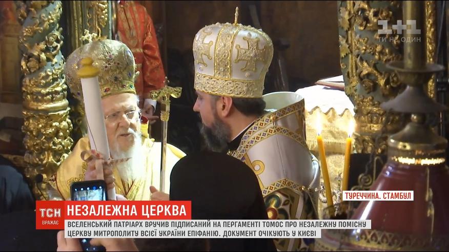 Вселенський патріарх вручив писаний на пергаменті Томос про незалежну помісну церкву Митрополиту всієї України Епіфанію. Зима минула, заявив Варфоломій, і додав, що розпочинається нова сторінка в українській історії. Президент Порошенко порівняв отримання Томосу з проголошенням незалежності України.