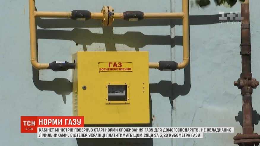 Відтепер українці платитимуть щомісяця за три кубометри газу. Ця норма була встановлена ще 2016 року, проте, за рішенням суду, її скасували, і споживачам прийшли платіжки утричі більші, ніж зазвичай. В уряді закликали громадян не платити за завищеними нормами і рекомендували компанії "Нафтогаз" профінансувати встановлення газових лічильників.