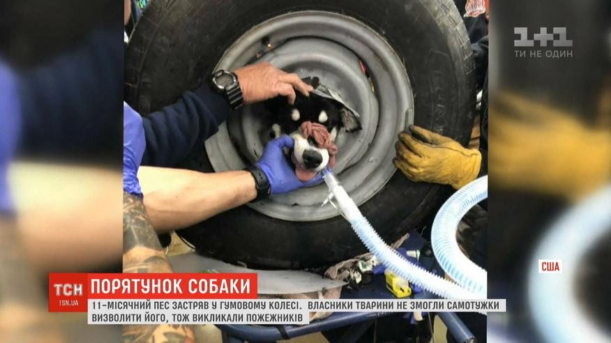 Песик заліз туди невідомо як, поки господарі були в будинку. Коли ті вибігли на гучний гавкіт, побачили, що тварина не може висунути голову з колеса. Спочатку спробували витягти собаку, намиливши край отвору. Коли це не допомогло, викликали рятувальників.