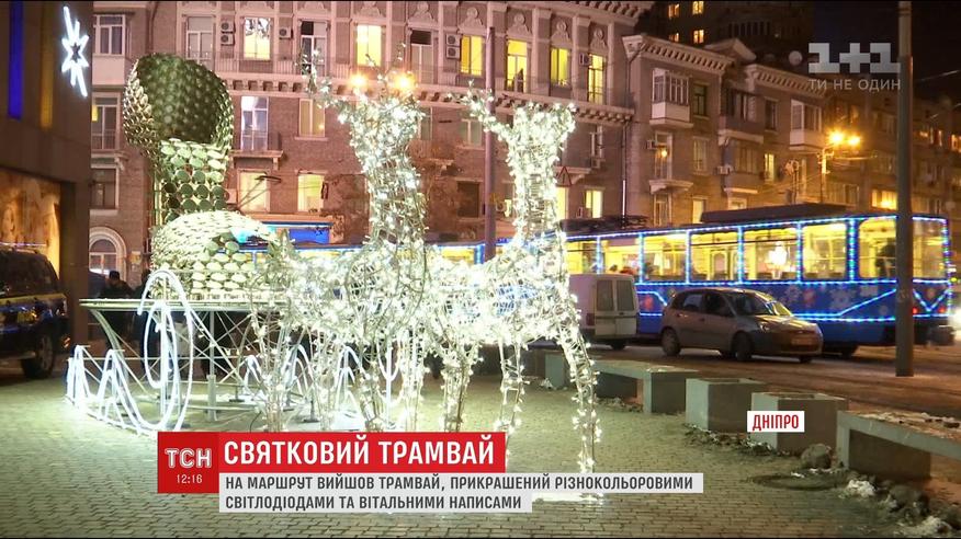 Ялинка на колесах - так пасажири й пішоходи нарекли новорічний трамвай, який до свят запустили у місті. Його прикрашають понад сім тисяч різнокольорових світодіодів та вітальні написи. У такий спосіб, мерія вирішила покращити дніпрянам настрій. Новорічною ілюмінацією оздобили звичайні вагони, що курсують середмістям.