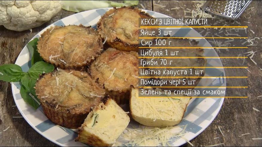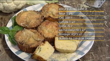 Дієтичні і смачнющі! Ловіть рецепт незвичних кексів від Руслана Сенічкіна, нам знадобиться: яйце - 3 шт., сир - 100 г., цибуля - 1 шт., гриби - 70 г., цвітна капуста - 1 шт., помідори чері - 5 шт., зелень та спеції за смаком.