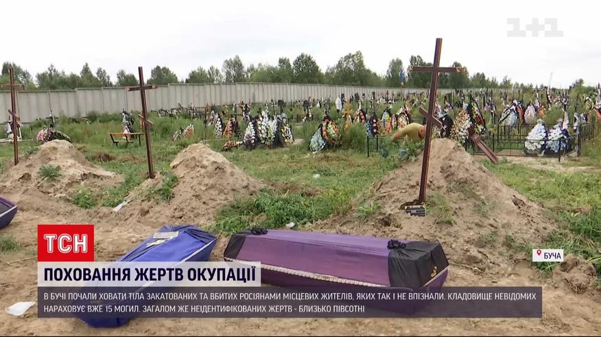 В Бучі почали ховати тіла закатованих та вбитих росіянами місцевих жителів, яких так і не впізнали. Кладовище невідомих від 9 серпня має 15 могил, загалом неідентифікованих близько пів сотні. Переважно це тіла із братських могил та людські останки зі спалених рашистами цивільних автівок. Дозвіл на поховання дали слідчі прокуратури, які розслідують воєнні злочини російських солдатів.