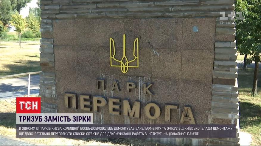 Декомунізував, бо увірвався терпець. У Києві в одному з парків колишній боєць-доброволець демонтував барельєф-зірку із радянською зіркою та написом СССР та замінив його на тризуб. Парк Перемоги присвячений перемозі у німецько-радянській війні. У Інституті національної пам'яті кажуть - таких випадків ставатиме більше. І пропонують КМДА ретельно переглянути списки об'єктів, що підпадають під демонтаж.