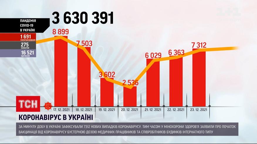 Понад 7 тисяч нових випадків коронавірусу в Україні - оновлена статистика від МОЗ. Найбільше хворих зафіксували в столиці - тут занедужали 1200 людей. 275 українців минулої доби померли від ускладнень, які спричинив COVID. А понад півтори тисячі потрапили на лікарняні ліжка. Тим часом в Україні починають вакцинацію від коронавірусу бустерною дозою. Більше про коронавірус в Україні