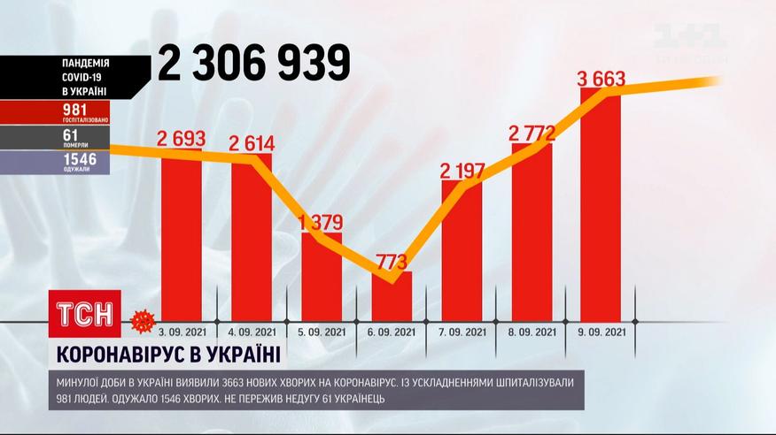 3663 нових хворих на коронавірус за минулу добу - це майже на тисячу більше, ніж напередодні. Серед лідерів за приростом хворих - столиця, Львівська та Харківська області. Із ускладненнями хвороби до лікарень доправили майже тисячу людей. Одужало трохи більше, ніж півтори тисячі хворих. Не пережив недугу 61 українець. Більше про коронавірус в Україні