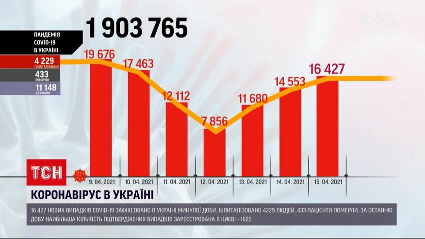 16,5 тисячі нових випадків за добу. МОЗ оприлюднило нові дані про поширення коронавірусу в Україні. Найбільша кількість підтверджених випадків зареєстрована Києві - 1 625, Більше тисячі нових хворих у Харківській, Хмельницькій, Запорізькій та Дніпропетровській областях. Понад 4 тисячі недужих довелося ушпиталити, 433 людини померли.