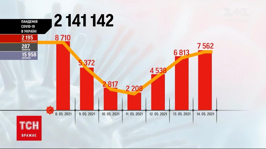Понад 2 тисячі хворих на коронавірус довелося ушпиталити минулої доби в Україні. А от тих, хто одужав - усемеро більше. Водночас 287 людей недугу здолати не змогли. Це свіжа статистика МОЗ. Там повідомляють про 7,5 тисячі нових випадків коронавірусу. І додають - другий день поспіль за темпами поширення інфекції лідирують Київ та Харківська область. Дивіться також: Світовий банк дасть 90 мільйонів євро Україні на вакцинацію від коронавірусу Коронавірус в Україні: до нас може дістатись індійський штам вірусу Уряд установив розмір компенсацій у разі інвалідності чи смерті після вакцинації