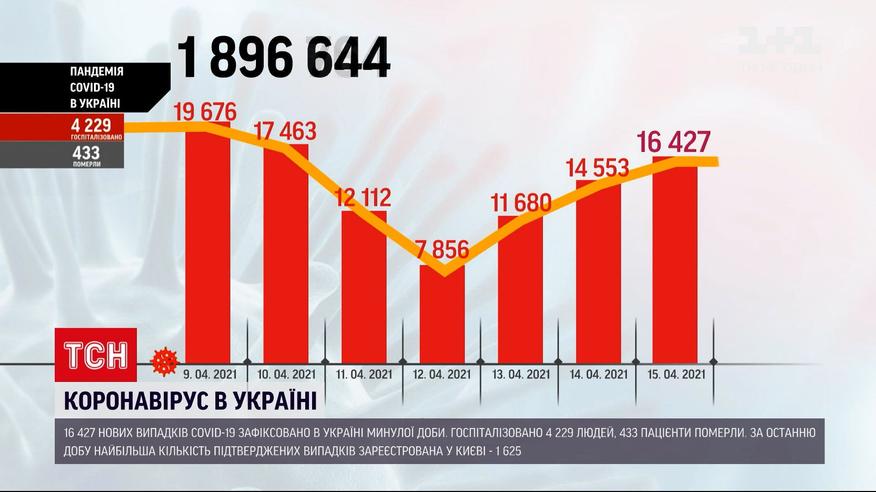 16,5 тисячі нових випадків за добу. МОЗ оприлюднило нові дані про поширення коронавірусу в Україні. Найбільша кількість підтверджених випадків зареєстрована Києві - 1 625, Більше тисячі нових хворих у Харківській, Хмельницькій, Запорізькій та Дніпропетровській областях. Понад 4 тисячі недужих довелося ушпиталити, 433 людини померли.