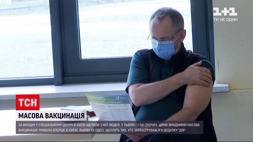 Захворюваність йде на спад. Трохи більше тисячі українців отримали позитивні тести на коронавірус у неділю. Не пережили недугу 64 людини. І за вихідні маємо збільшення кількості вакцинованих. Принаймні 3,5 тисячі людей у Києві і понад тисяча у Львові. Це результати масової вакцинації від коронавірусу в Україні. Цими вихідними вона тривала вперше.