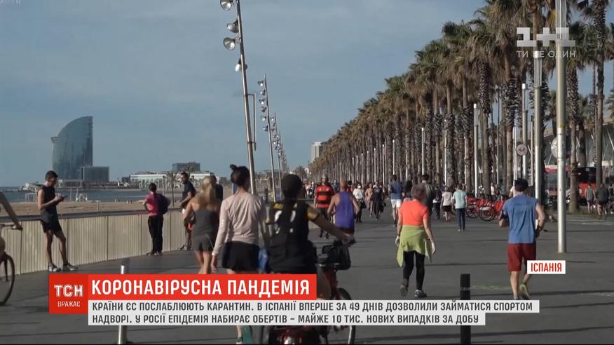 Європа стрімко відмовляється од карантинних обмежень. В Австрії можна вільно виходити на вулицю компаніями до 10 людей. Перукарні та торгові центри відновили роботу. А іспанцям уперше за 49 днів дозволили займатися спортом надворі. Тим часом у Росії черговий антирекорд – майже 10 тисяч нових випадків зараження за добу.