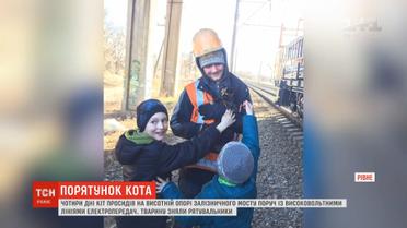 Тварина якось залізла під конструкцію залізничного мосту заввишки зо 10 метрів. А от вилізти вже не змогла. Чотири дні кіт просидів поруч високовольтних електроліній, доки його нявчання не почули діти, які проходили повз разом із мамою. Викликали рятувальників, однак через напругу в близько 10 тисяч вольт діставатися до тварини було небезпечно. Врешті приїхали електрики, вимкнули напругу та дістали бідолаху.