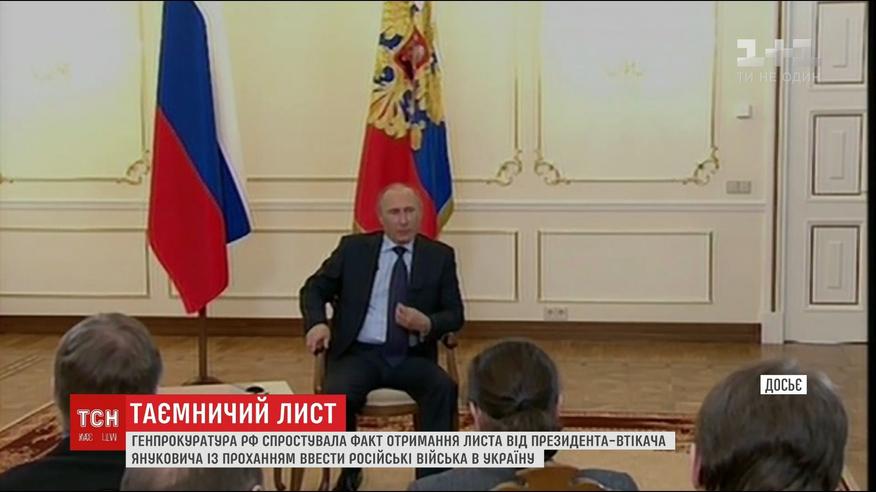 Повідомлення від генпрокуратури Росії оприлюднив на своїй офіційній сторінці Юрій Луценко. Також у Генпрокуратурі РФ запевняють, що будь-які заяви Януковича не були підставою для звернення Путіна до Ради Федерації про дозвіл на використання російських військ в Україні. Однак, ще в березні 2014 року лист-звернення оприлюднив Віталій Чуркін.