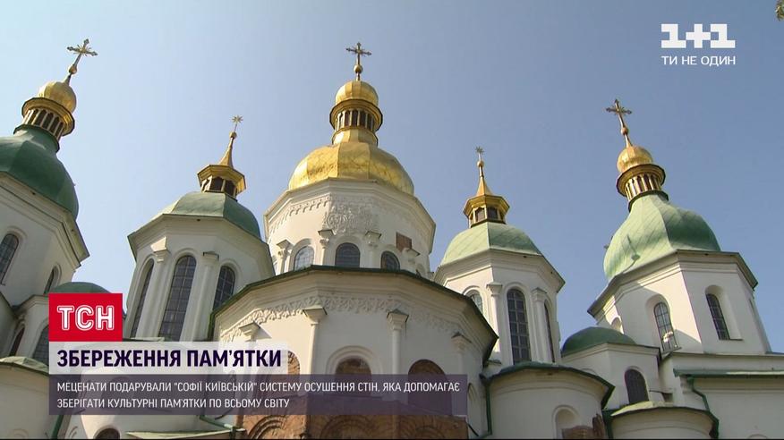 Софії Київській подарували систему осушення стін, яка допомагає зберігати культурні пам’ятки у всьому світі. Таку систему вже використовують у замках Італії та Польщі: її технологія дає змогу осушити стіни природним шляхом, не вдаючись до будівельних робіт. Волога в стінах заповідника перевищує норму. За перший рік роботи цієї системи показник має впасти втричі. 28-м швейцарських приладів, які мають усунути причину надмірної вологості, закупили коштом українських меценатів.