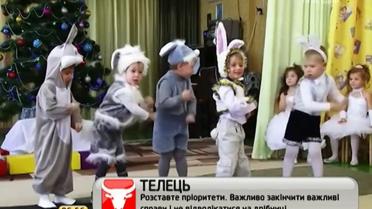 Хлопчики в костюмах зайчиків вийшли до ялинки представити свій танцювальний номер. І хоч діти рухалися не синхронно, але старалися. Та в одного хлопчика із танцями виникли проблеми.