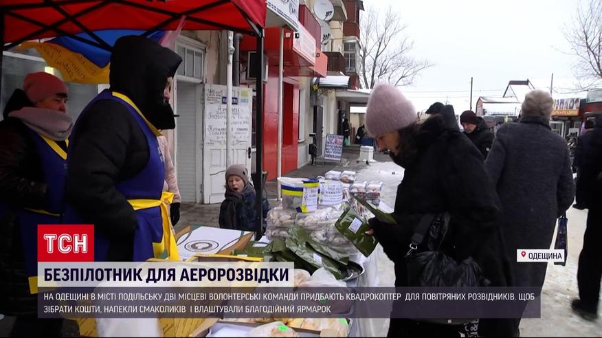 Безпілотник для аеророзвідки. На Одещині в місті Подільську дві місцеві волонтерські команди придбають квадрокоптер для повітряних розвідників. Ці волонтери вже майже два роки відправляють гарячу їжу на фронт. Цього разу, щоб зібрати кошти, напекли тістечок, тортів та здоби і влаштували благодійний ярмарок на місцевому базарі. До волонтерок долучились і музиканти, які на морозі відіграли благодійний концерт. До вторгованих за день 60 тисяч гривень додали зібрані раніше гроші, щоб разом із дроном відправити на Куп’янський напрямок генератори, обігрівачі та теплі берці.