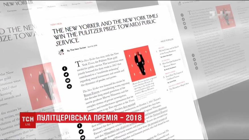 У Нью-Йорку оголосили лауреатів Пулітцерівської премії – однієї з найпрестижніших у журналістиці та літературі. Газети "The Times" та "The Washington Post" отримали нагороду за матеріали про розслідування втручання Росії в американські вибори. "The New York Times" та журнал "The New Yorker" нагородили за висвітлення скандалу навколо Гарві Вайнштейна та руху #MeToo.