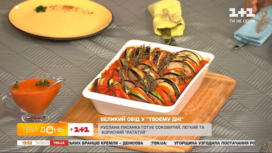Сьогодні готуємо легкий і корисний обід – рататуй. Для страви знадобляться: 1 шт. кабачок, 1 шт. цукіні, 1 шт. баклажан, 10 шт. томат, 1 шт. червоний солодкий перець, 3 гіл. чебрець, 5 ст. л. рослинна олія, сіль, перець. Смачного!