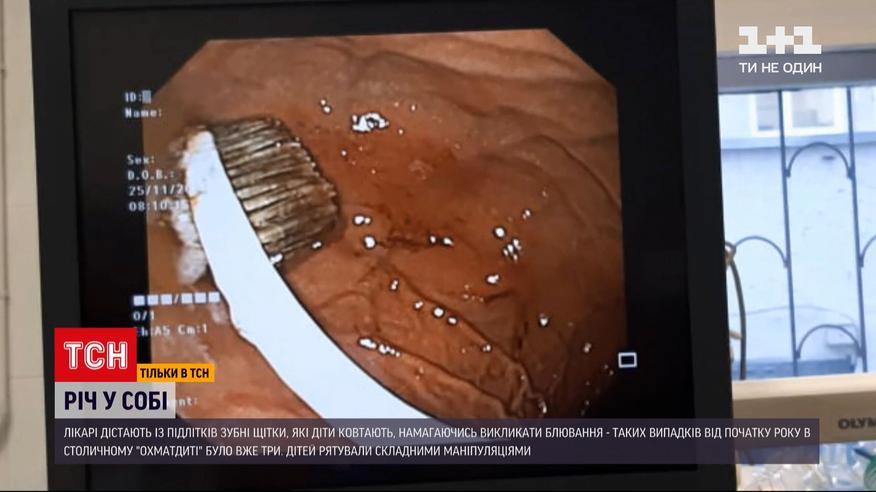 Зубна щітка - в дитині. Вже втретє за цей рік лікарям столичного "Охматдиту" доводиться робити складні маніпуляції, аби витягти з дитячих шлунків через стравохід зубні щітки. Ковтають їх діти з розладами харчової поведінки. Ненавмисно, але на шкоду собі. Про зубну щітку, яку медики витягали вшістьох - дивіться далі.