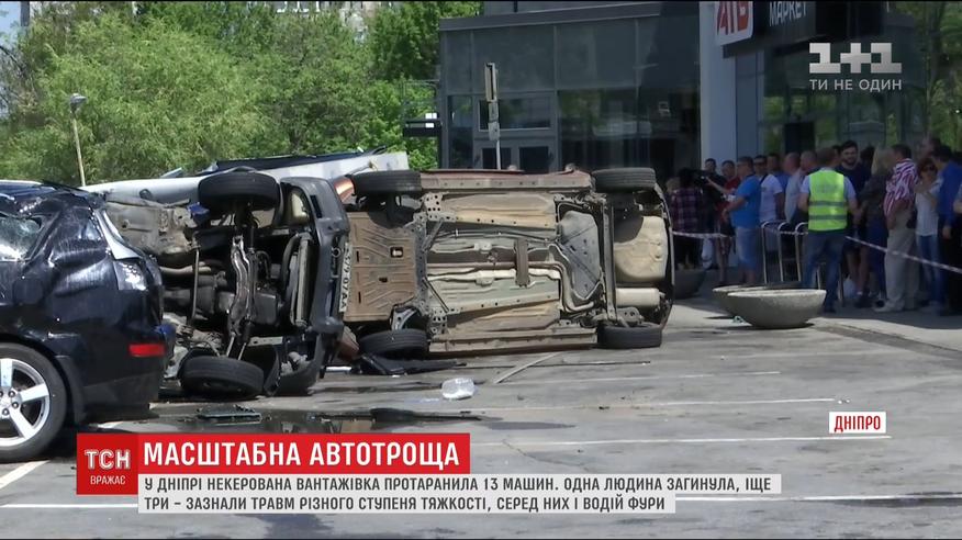 На відео з камери спостереження видно, як вулицею спускається фура, завантажена трубами. Некерована вантажівка вилітає на зустрічку, зачіпає три авто. Білий бус просто розчавлює об стовп, його 30-річний водій загинув одразу. Водій вантажівки відбувся забиттями. ТСН поспілкувалась з людьми, яким дивом вдалось вціліти.