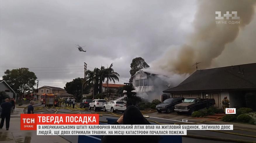 У Каліфорнії маленький літак впав на житловий будинок. Загинуло двоє людей, іще двоє отримали травми. Постраждалих з опіками забрали до лікарні. На місці катастрофи спалахнув вогонь, на знятих очевидцями кадрах видно уламки літака та ошелешених людей.