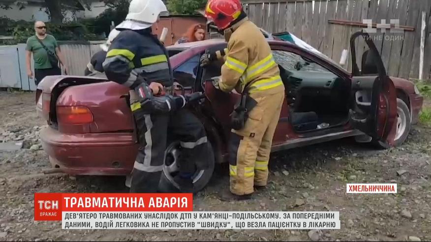 У Кам'янці-Подільському зіткнулася "швидка допомога" з легковим авто. Медики везли в лікарню пенсіонерку. "Швидка" мчала з увімкненими звуковими та світловими сигнальними маячками, але на перехресті двох вулиць "Хонда" її не пропустила. У результаті семеро людей з різними травмами та переломами опинилися у реанімаційному та травматологічному відділеннях Кам'янець-Подільської районної лікарні. Не госпіталізували лише водія та лікарку "швидкої" , бо у них забої. У хворої жінки, яку везли у лікарню з приступом хронічного захворювання, ще й додалися переломи шийних хребців. Трьох пасажирів "Хонди" рятувальники витягали з машини з допомогою спецінструментів. Водію легковика вже зробили дві операції - він у найтяжчому стані.