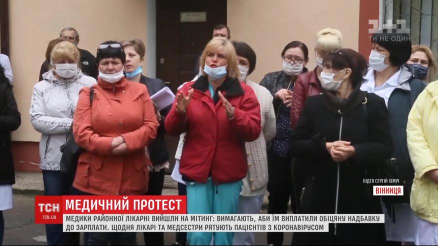 Мітинг медиків у Вінниці. Зранку лікарі та медсестри районної лікарні вийшли на акцію протесту. Кажуть, за лікування хворих на COVID-19 їм обіцяли 300 відсотків надбавки до зарплати, натомість отримали "голу" ставку - у середньому 4 тисячі гривень. Лише кілька медичних сестер побачили доплату у розмірі півтори гривні на людину.