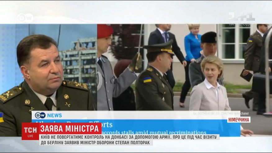 Про це заявив міністр оборони Степан Полторак. Під час візиту до Берліну він дав інтерв'ю журналістам "Німецької хвилі". За словами міністра оборони, у Києві не розглядають такий спосіб, як вирішення проблеми захоплення східних областей. Полторак також анонсував рішення уряду і президента для повернення непідконтрольних регіонів і анексованого Криму.