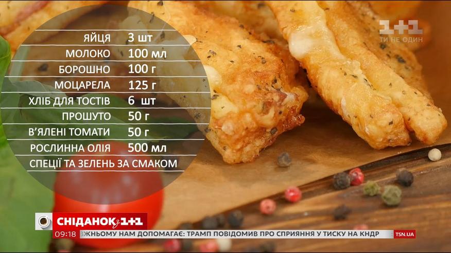 Наша журналістка Ірина Гулей дуже багато подорожує Італією і зібрала вже чимало цікавих рецептів. Але Руслан Сенічкін має ще один, не менш смачний - вам знадобиться: яйця - 3 шт, молоко - 100 мл, борошно - 100 г, моцарела - 125 г, хліб для тостів - 6 шт, прошута - 50 г, в'ялені томати - 50 г, рослинна олія - 500 мл, спеції та зелень за смаком.