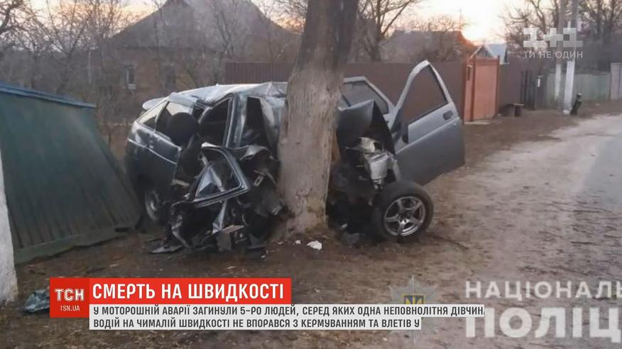 Уночі легковик із 6-тьма молодими людьми в салоні на повній швидкості влетів у дерево. Свідки розповіли, що чули як автомобіль розганявся сільською вулицею, а на повороті водій навіть не пригальмував. Після удару авто зім'яло до непізнаваності, людей затисло в салоні.