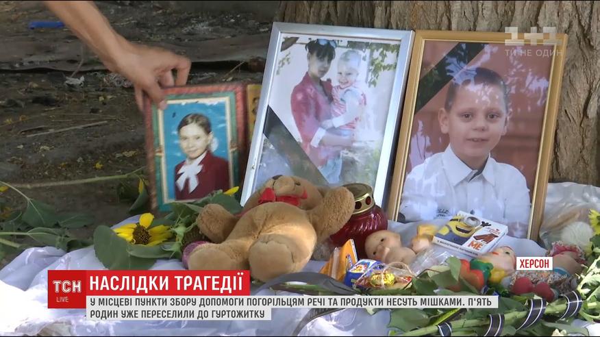 Їх ховатимуть завтра. А батько родини і далі у реанімації у вкрай тяжкому стані. Мешканцям першого поверху нині дозволили зайти у свої квартири і забрати речі. Другий - вигорів вщент. П'ять родин, які сказали, що не мають де жити, вже переселили до гуртожитку. Для погорільців у місті зорганізували три пункти збору допомоги. Херсонці вже знесли туди масу речей і продуктів.