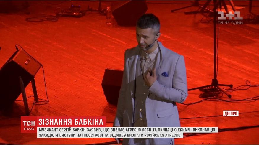 Цього домоглися активісти у Дніпрі. Напередодні концерти Сергія Бабкіна у Львові та Тернополі були зірвані через протести. Виконавцю закидали виступи у Криму після окупації та відмову визнати агресію Росії. У Дніпрі перед залом, де мав виступати Бабкін, теж зібралися зо два десятки активістів. На сцені співак публічно відповів на запитання активістів.