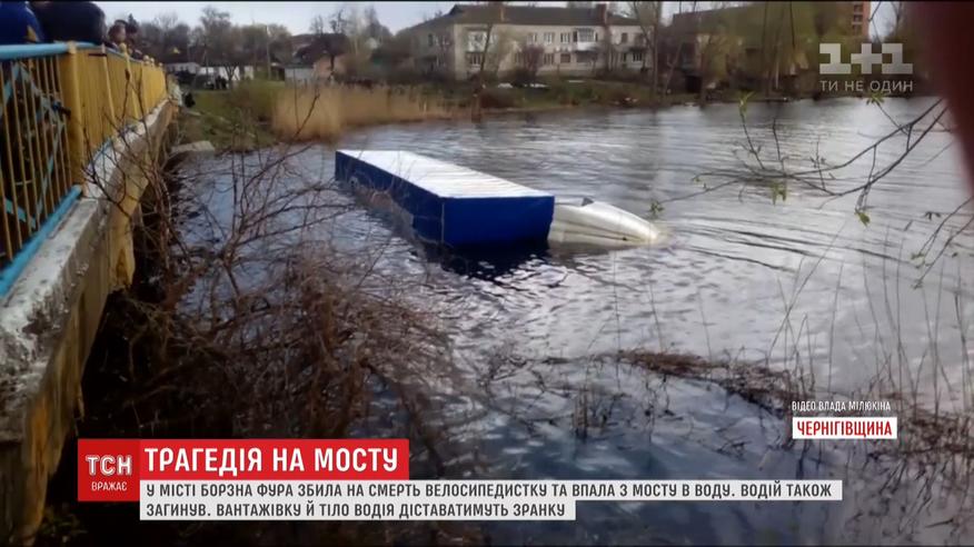 Фура збила на смерть жінку і впала з мосту у воду. Трагедія сталася у місті Борзна надвечір.. Ці кадри зафільмували очевиці. За їхніми словами, на мосту в середмісті вантажівка несподівано виїхала на зустрічку, де в цей час їхала велосипедистка. Від удару вона загинула на місці. А після зіткнення фура просто вилетіла з мосту. Водій також загинув