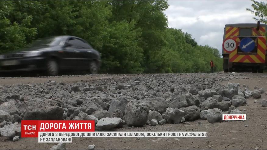 Згідно з договором закупівлі, щоби відремонтувати 15 кілометрів шляху купили 830 тон шлаку, з доставкою – це майже сто тисяч гривень. Голова області пояснює на асфальтування грошей немає. Військові медики попереджають, що змушені возити поранених бійців цим шляхом надзвичайно повільно. Для знімальної групи ТСН експеримент на дорозі закінчився шиномонтажем.