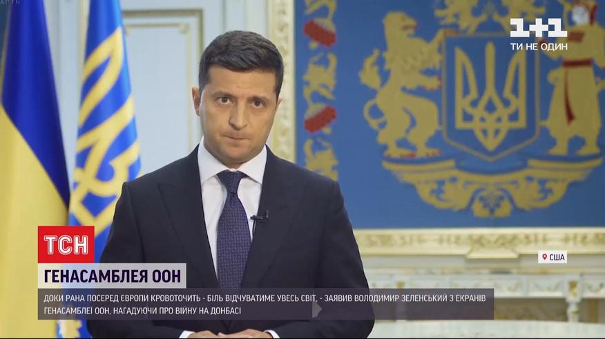 Доки рана всередині Європи кровоточить - біль відчуватиме весь світ, заявив Володимир Зеленський з екранів Генасамблеї ООН, нагадуючи про війну на Донбасі. За словами Зеленського, першочерговим кроком має стати режим тиші, виведення незаконних збройних формувань з окупованих територій, далі –повернення контролю над державним кордоном і відновлення територіальної цілісності України. Цього року всі лідери держав вперше в історії виступають на дебатах в Нью-Йорку заочно. Детальніше – у сюжеті.