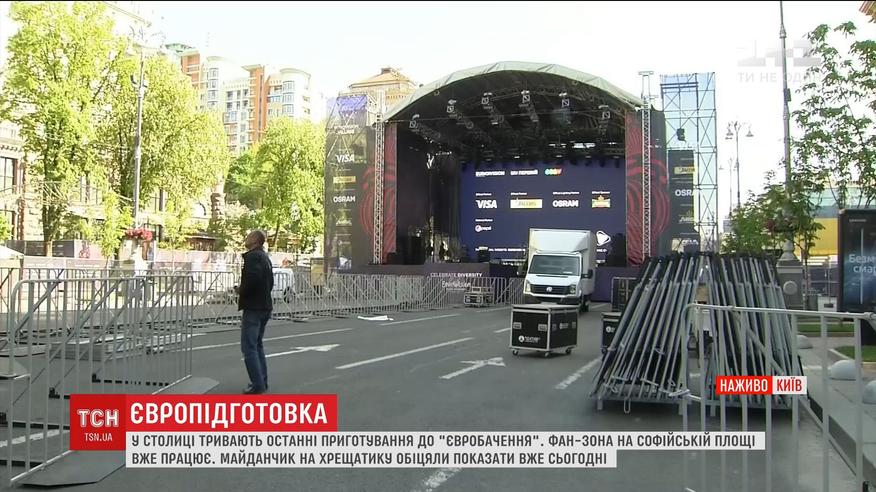 Впродовж вечора встановлять металошукачі. Людей почнуть пускати завтра о 12:00. До кінця фан-зона наразі не змонтована. Поліція озвучила перелік речей, які заборонено проносити з собою у фан-зону. В Києві працюють ще 4 неофіційні відкриті майданчики.