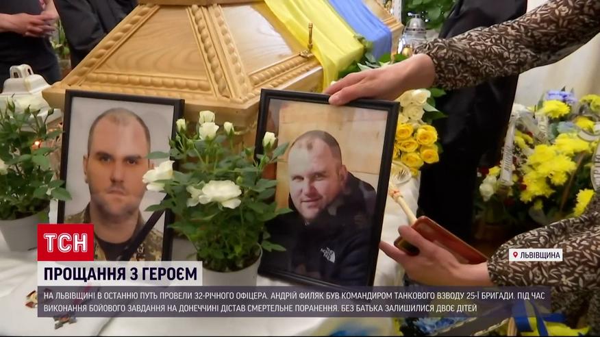 Прощання з героєм. На Львівщині в останню путь провели 32-річного офіцера, який загинув на фронті. Андрій Филяк пішов воювати у квітні 2022 року. Був командиром танкового взводу 25 бригади. Під час виконання бойового завдання на Донеччині дістав поранення, несумісне з життям. Без батька залишилися двоє дітей. Подробиці - у матеріалі ТСН.
