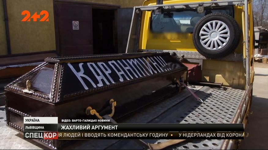 Чоловік їздить евакуатором трьома містами області: Трускавцем, Стебником й Дрогобичем. А на тім евакуаторі міцно закріплена труна. На автомобілі наліплений плакат із написом латиною: «Stop COVID-19», а на труні білою фарбою, вже українською, виведені слова: «карантин» та «сиди дома». Чоловік каже, влаштував таку візуальну жахачку, бо попри всі попередження, дуже багато людей все одно тиняються вулицями без нагальної потреби. Як це було – дивіться у сюжеті. Повні випуски дивіться на 1+1 video