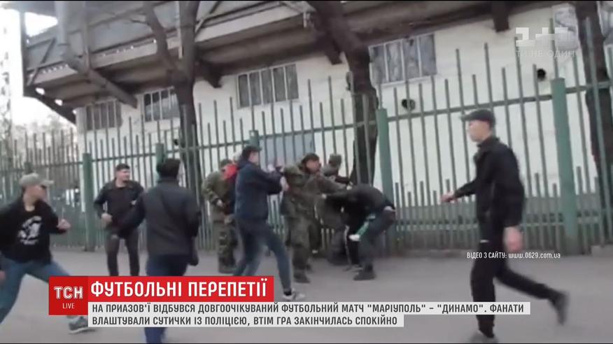 Під час футбольного матчу Маріуполь-Динамо фанати киян запалили файери, димові шашки та петарди. Поліцейські вивели їх з трибун за межі стадіону. Відбивати вболівальників пішли ультраси обох команд. Розпочалася сутичка між копами та численною групою підтримки затриманих. Семеро службовців постраждали, є інформація про травмованих журналістів.