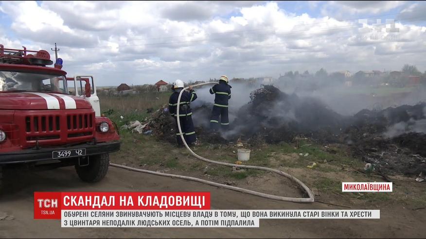 Кілька тонн старих хрестів і пластикових вінків, які напередодні поминальних днів повигрібали з кладовища і мали вивезти на звалище, селищна влада чомусь вивантажила неподалік людських осель. Коли селяни обурилися, зокрема і в соцмережах. Наступного дня сміття загорілось, і це розгнівало людей ще більше.