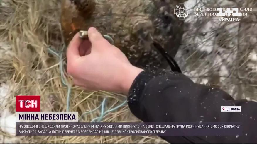 Чергову протикорабельну міну знешкодили на Одещині. Боєприпас хвилями викинуло на берег, тож і знищували його на суші. Спеціальна група розмінування Військово-морських сил ЗСУ спочатку на місці викрутила запал, а потім перенесла знахідку на визначену територію, де й здійснила контрольований підрив.