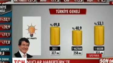 За попередніми підрахунками, політична сила президента Ердогана «Справедливість і розвиток» отримала майже 50% голосів виборців. Такий результат дасть партії більшість місць у парламенті. Прем'єр-міністр країни Ахмет Давутоглу закликав всі політичні сили Туреччини, які потрапили до нового парламенту, об'єднатися для написання нової конституції країни.