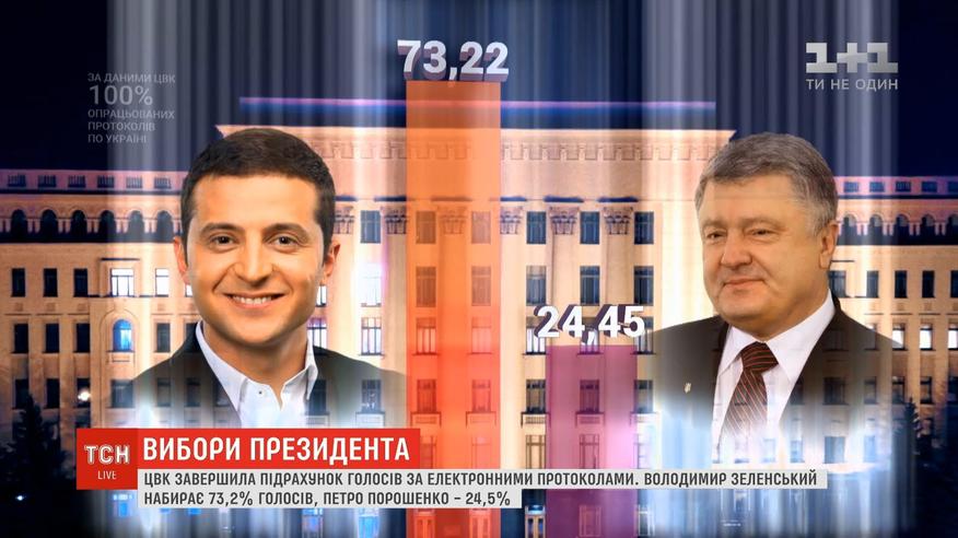 ЦВК завершила підрахунок електронних протоколів. Володимир Зеленський набирає трохи більше 73% народних симпатій. Петро Порошенко - майже 25%. Остаточні результати виборів президента мають оголосити після того, як ЦВК прийме і опрацює усі протоколи в паперовому вигляді. Зробити це планують на початку наступного тижня.