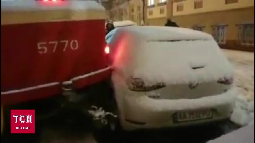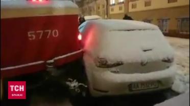 Через негоду у Києві зійшов із рейок трамвай і блокував рух. До того ж хвостову частино його занесло і збило припарковану автівку.