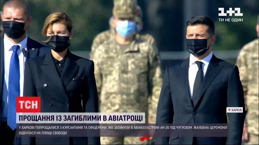 У цілковитій тиші та під гуркіт літаків. У Харкові на центральній площі попрощалися із загиблими у авіатрощі під Чугуєвом 25 вересня. Участь у церемонії взяв президент Володимир Зеленський. Труни з тілами офіцерів та курсантів накрили державними прапорами, після виконання Гімну над площею пролетіли військові літаки.