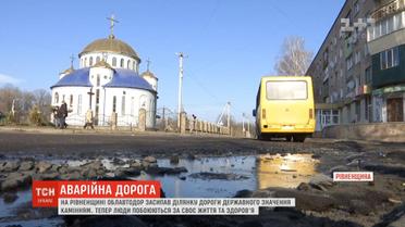 Півтора кілометри суцільного жаху - так на Рівненщині називають відрізок дороги державного значення, що пролягає через селище Квасилів. Капітального ремонту цей шлях не бачив від часу його прокладання. Через численні скарги водіїв шляховики ями засипали камінням. І тепер воно розлітається у всі боки з-під автівок.