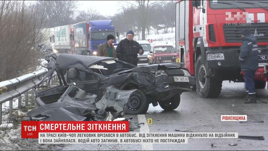 Смертельна аварія сталась на трасі Київ-Чоп. Від зіткнення автівку відкинуло у відбійник, бензобак пошкодило і машина зайнялася. Її кермувальник від завданих травм помер на місці. У автобусі були водій та один пасажир, вони не постраждали. У поліції наразі з'ясовують, чому автівка виїхала на смугу зустрічного руху.