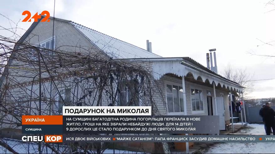 У Сумській області багатодітна родина погорільців із села Коровинці переїхала в нове житло, яке їм допомогли придбати небайдужі люди. Свій колишній дім, в якому мешкали 14 дітей та 9 дорослих, вони втратили під час пожежі. Тепер новий дах над головою багатодітна родина вважає справжнім дарунком від Святого Миколая. Повні випуски дивіться на 1+1 video